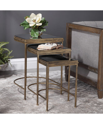 Set Of Three Nesting Tables With An Elegantly Curved Hand Forged Iron Frame, Finished In Antique Brushed Gold With Beveled Mirror Tops. Sizes: Sm-13x13x18, Med-15x16x21, Lg-18x19x24Uttermost's Furniture Combines Premium Quality Materials With Unique High-style Design.With The Advanced Product Engineering And Packaging Reinforcement, Uttermost Maintains Some Of The Lowest Damage Rates In The Industry. Each Product Is Designed, Manufactured And Packaged With Shipping In Mind.