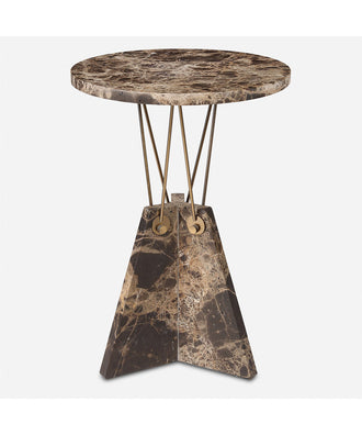 • Features: This geometric table features a round top and base made of rich emperador brown marble connected by iron rods finished in brass with knurled knob accents. due to the nature of marble, each piece will have an unique coloration and veining pattern.