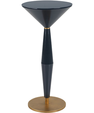 Sleek and architectural, this accent table features iron construction lacquered in navy blue with antique brass accents.