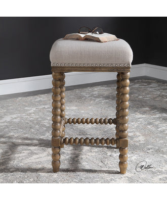 A Casual Statement Counter Stool Featuring Spindle Turned Legs And Carved Trim Finished In A Light Walnut Stain. Plush Seat Is Tailored In A Soft Ivory Linen Blend Fabric Accented With Brushed Nickel Nail Head Trim. Seat Height Is 26".Uttermost's Furniture Combines Premium Quality Materials With Unique High-style Design.With The Advanced Product Engineering And Packaging Reinforcement, Uttermost Maintains Some Of The Lowest Damage Rates In The Industry. Each Product Is Designed, Manufactured And Packaged With Shipping In Mind.