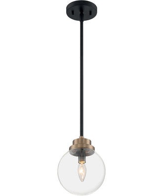 The 8" Axis 1-Light Pendant in Matte Black with Brass Accents is a stunning addition to any home or office space. This pendant light features a sleek matte black finish that exudes modern sophistication, complemented by the warm brass accents that add a touch of vintage charm. The clear globe glass encases the light bulb, creating a striking visual effect that enhances the overall aesthetic of the fixture.