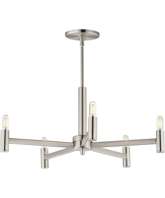 Straight extensions of rectilinear arms emanate from a cylindrical center housing in this transitional design. The candelabra is made in a corresponding cylindrical form playing into the geometries of this streamlined chandelier design. Available in a textured sandy Black or Natural Aged Brass, this collection pairs well with many design aesthetics at an economical price point. Use tubular lamps for an industrial or more modern aesthetic or torpedo shape for an update to the conventional chandelier design.