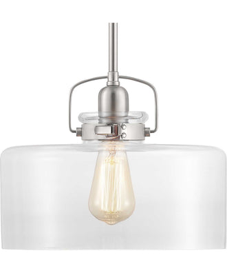 Embrace the charm of vintage-inspired design with the Calhoun 1-Light Pendant in Brushed Nickel. This exquisite lighting fixture combines timeless elegance with modern functionality, making it a perfect addition to any home decor. The pendant features a clear glass shade that draws inspiration from apothecary jars, offering a thickened profile that exudes a classic handmade appearance. The brushed nickel finish adds a touch of sophistication, seamlessly blending with various interior styles.
