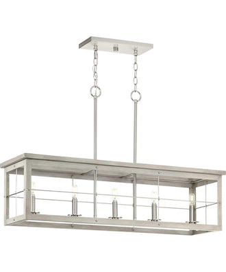 Transform your home with the Hedgerow 5-Light Grey Washed Oak Farmhouse Style Linear Island Chandelier Light. With its blend of rustic charm and urban sophistication, this chandelier is sure to become a focal point in any room. Don't miss out on the opportunity to enhance your home's ambiance and style. Order now and enjoy the perfect combination of beauty and functionality.