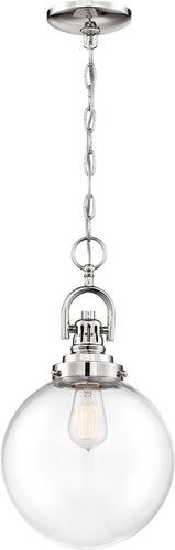 The 10"W Skyloft 1-Light Pendant in Polished Nickel with Clear Glass is a stunning addition to any home or office space. This pendant light features a sleek, modern design that combines the timeless elegance of polished nickel with the clean, airy feel of clear glass. The round, globe-shaped glass shade beautifully encases the light bulb, creating a sophisticated and contemporary look that complements a variety of interior styles.