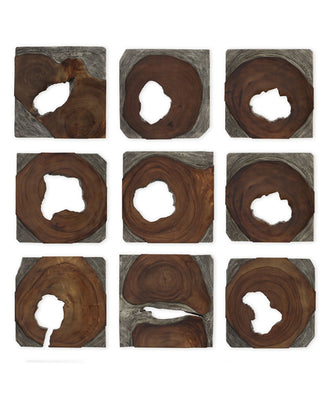 This set of nine wood wall pieces is crafted from 100% natural suar wood in a dual dark coffee brown and rustic black carved finish. due to each piece being individually handcrafted, natural variation will occur from piece to piece.