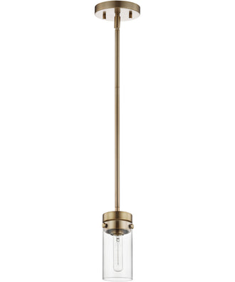 The Intersection 1-Light Pendant in Burnished Brass by Nuvo Lighting is a stunning addition to any home or office space. Its sleek and modern design features a cylindrical clear glass shade that elegantly encases the light bulb, creating a sophisticated and minimalist look. The burnished brass finish adds a touch of vintage charm, making it a versatile piece that complements various interior styles, from contemporary to industrial and even transitional themes.