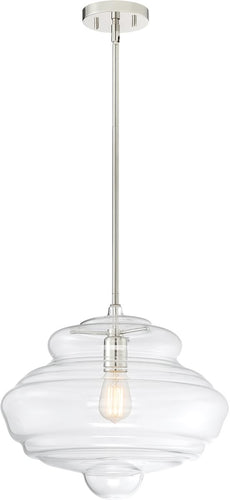 Introducing the 16" Storrier 1-Light Pendant by Nuvo Lighting, a stunning blend of modern elegance and timeless design. This pendant light features a polished nickel finish that exudes sophistication and a clear glass shade that adds a touch of contemporary flair. The unique shape of the glass shade, with its smooth, rounded contours, creates an eye-catching focal point that enhances any room's aesthetic.