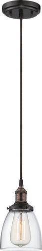 Introducing the 5"W Vintage 1-Light Pendant in Rustic Bronze by Nuvo Lighting, a stunning addition to any home or office space. This exquisite pendant light combines timeless design with modern functionality to create an inviting atmosphere. The clear glass shade and vintage lamp included add a touch of elegance and sophistication to your décor.