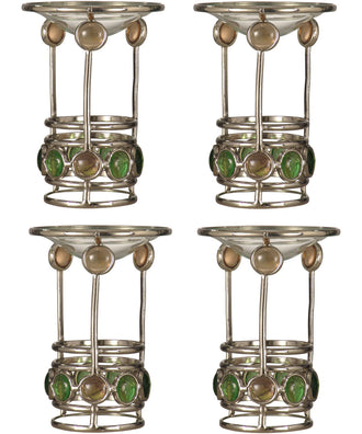 Always at the forefront of home design trends, we are pleased to present our Pietro 4-Piece Candle Holder Set. The set includes 4 matching metal frame candle holders in a golden finish. We added a row of alternating green and amber art glass gems around the base and smaller amber glass gems just under the glass martini style candle cup for colorful sparkle and shine. The holders are perfect for displaying ball candles (candles not included). Each holder is pretty when displayed on its own; try displaying in different combinations for a look that is yours alone. Our Pietro 4-Piece Candle Holder Set also makes a wonderful gift for any occasion whose recipient will proudly display for many years to come.