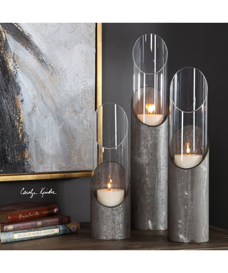 This Set Of Three Candleholders Features A Sleek Angular Design In Raw Iron And Clear Glass Cylinders With Three 3"x 3" Distressed Beige Candles Included. Sizes: Sm-4x14x4, Med-4x18x4, Lg-4x22x4Uttermost's Accessories Combine Premium Quality Materials With Unique High-style Design.With The Advanced Product Engineering And Packaging Reinforcement, Uttermost Maintains Some Of The Lowest Damage Rates In The Industry. Each Product Is Designed, Manufactured And Packaged With Shipping In Mind.