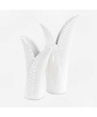 This set of two beautifully crafted white ceramic vases captures the delicate beauty of nature. inspired by long elegant leaves found in nature. the smooth finish and delicately rippled edges highlight their refined design, making them perfect for showcasing your favorite flowers or as standalone art pieces. sizes: s-4x11x7, l-6x15x8