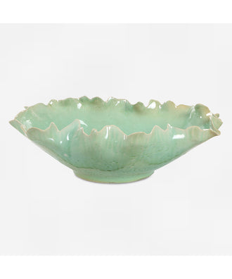 • Features: This elegant ceramic bowl features a stunning ruffled edge design, evoking the delicate shape of a blooming flower. its soft green glaze with a subtle crackle finish adds texture and sophistication, making it an ideal statement piece for any modern or classic decor. perfect for displaying as a centerpiece or for functional use, this bowl blends art and practicality effortlessly.