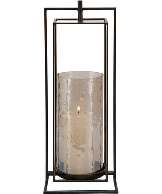 • Features: Illuminate your space with a warm glow from this textured glass and iron candle lantern. designed to hold a pillar candle, it features a removable textured glass hurricane and iron stand finished in dark bronze with gold rub-through details. one white 3"x 5" candle is included.