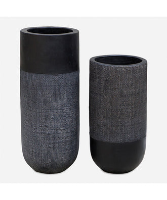 These black terracotta vases, adorned with woven fabric accents, blend earthy craftsmanship with a modern twist. the matte black finish contrasts beautifully with the textured fabric, creating a striking, artisanal piece. perfect for adding a touch of rustic elegance and contemporary style to any space. sizes: s-6x12x6, l-6x15x6