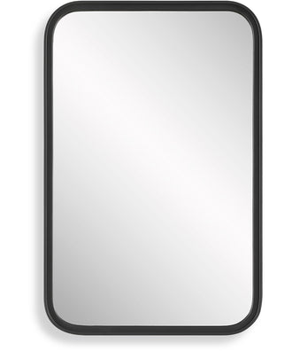 This contemporary rectangular mirror features rounded corners, offering a softer, more refined silhouette that contrasts beautifully with its bold matte black finish. The front profile of the frame showcases a distinctive step-down from the outer frame.