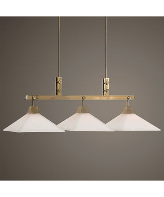 Enriched Industrial Style With A Hint Of Craftsman Lines Bring Together This Elegant Linear Chandelier Enhanced With An Aged Brass Finish And Etched, White Frosted Glass Shades. With 3-100 Watt Max, Edison Sockets And Includes 20' Wire, 6-12" Stems And 2-6" Stems For Adjustable Installation.Uttermost's Light Fixtures Combine Premium Quality Materials With Unique High-style Design.With The Advanced Product Engineering And Packaging Reinforcement, Uttermost Maintains Some Of The Lowest Damage Rates In The Industry. Each Product Is Designed, Manufactured And Packaged With Shipping In Mind.
