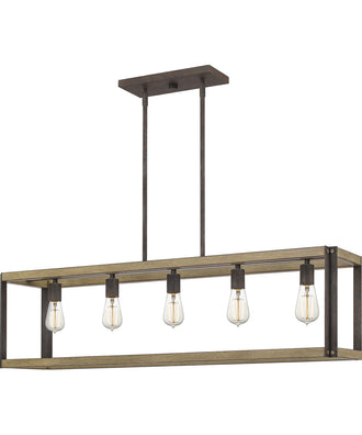 The open, airy design of the Finn collection easily complements many home décor styles. The rectangular silhouette is finished in Rustic Black and paired with a painted Natural Walnut finish to create a handsome farmhouse style fixture. The exposed bulbs allow for maximum light flow to illuminate any room.