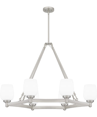 A fresh interpretation of the classic wagon wheel silhouette, Penning features opal etched glass shades that softly cast light. Whether in brushed nickel or matte black, the Penning chandelier delivers on updated traditional style. Hang this chandelier or island light in a foyer, formal dining room or kitchen for timeless style.