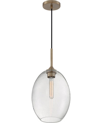 The 10"W Aria 1-Light Pendant in Burnished Brass is a stunning addition to any space, blending elegance with modern design. The pendant features a sleek burnished brass finish that exudes sophistication and warmth. The clear seeded oval glass shade adds a touch of vintage charm while allowing the light to shine through beautifully. This combination of materials and finishes creates a timeless piece that complements a variety of interior styles, from contemporary to traditional.