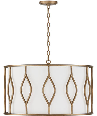 The Cohen 4-Light Pendant in Mystic Luster is a statement piece that brings a touch of luxury to any space. This pendant light features a sophisticated design with curved, open columns that frame a white fabric shade. The intricate metalwork adds a layer of elegance, making it a perfect centerpiece for your room.