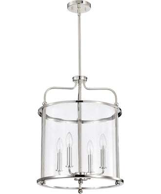 The Yorktown 4-Light Pendant in Polished Nickel is a stunning addition to any home or office space. Its sleek, cylindrical design features a polished nickel finish that exudes modern elegance and sophistication. The clear glass enclosure beautifully showcases the four incandescent bulbs, creating a warm and inviting ambiance. This pendant light is crafted from high-quality steel, ensuring durability and longevity.