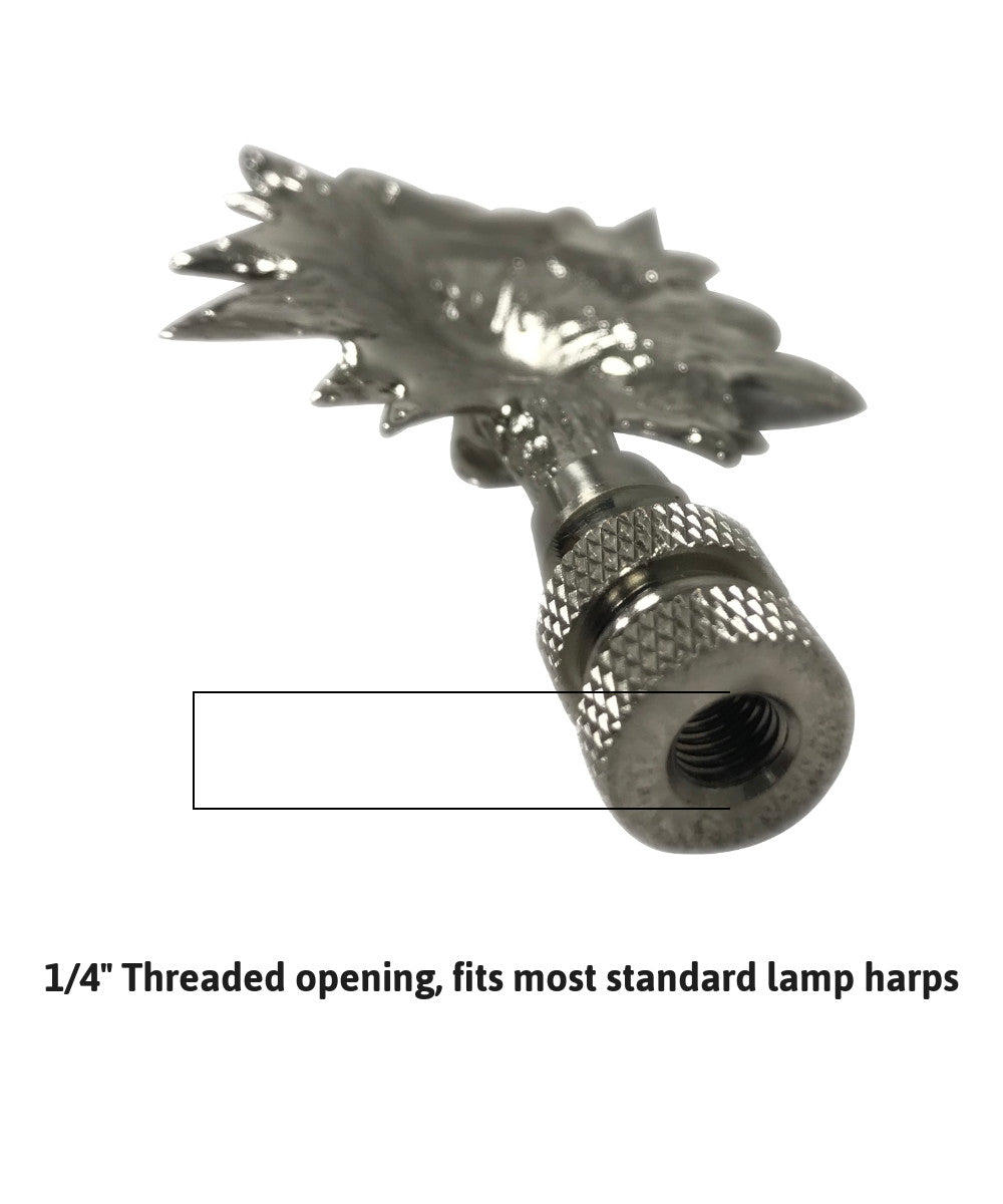 Designed for convenience, the Wolf Head Lamp Finial comes with a standard 1/4-inch-27 thread, which fits the harp on almost every lamp. This means you can easily screw it on or off, allowing for quick and hassle-free installation. The finial's threaded opening is 1/4 inch wide with 27 threads per inch, ensuring compatibility with 95% of all lamp harps. Whether you're updating an old lamp or adding a finishing touch to a new one, this finial is an ideal choice.