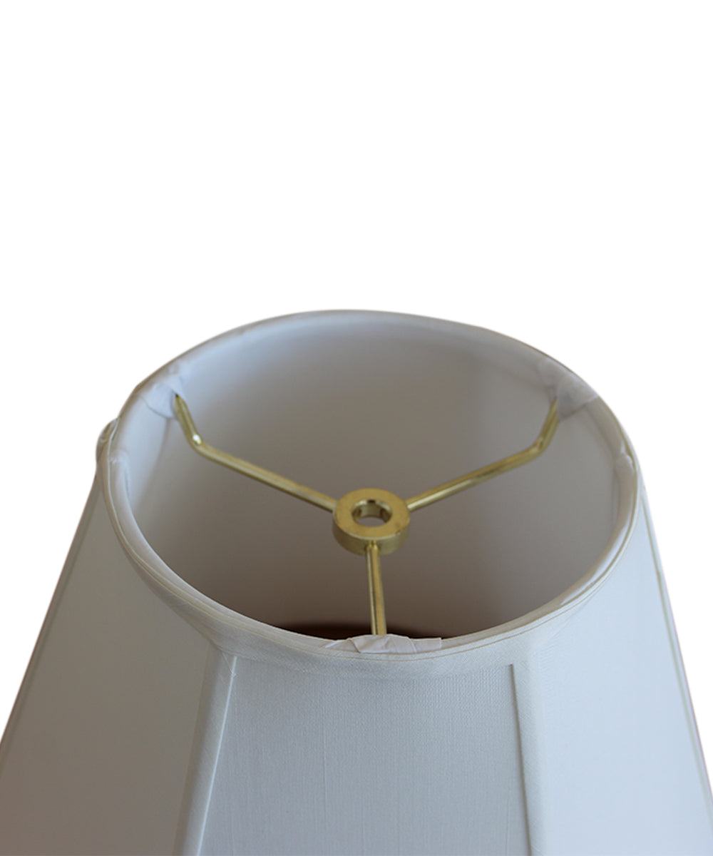 An empire lamp-shade is a traditional lampshade shape where the bottom is wider than the top. It also features straight sides, forming a kind of triangular shape. The bottom of the shade spreads out more to distribute light, and to shine outward and downward for nearby tasks. The smaller opening at the top helps to funnel bulb heat away from the lamp. An empire lampshade coordinates well with a lamp base featuring straighter or simpler lines, but also works well with almost any lamp shape.