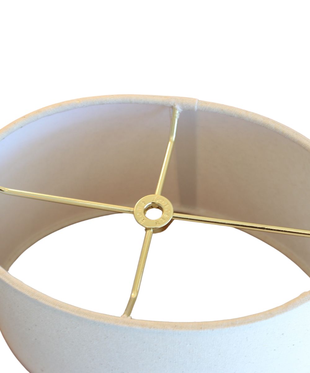 This oval drum lampshade is perfect for both table and floor lamps, making it a versatile choice for various lighting needs. Its dimensions of (6.5x10)" at the top, (8x12)" at the bottom, and a slant height of 7.5" make it an ideal fit for most standard lamps. The washer fitter, also known as a “spider” fitter, allows the shade to sit securely on top of your lamp harp, held in place by a finial or cap. With a drop of 1/2", the top of the washer sits just below the top of the shade, ensuring a sleek and polished look.