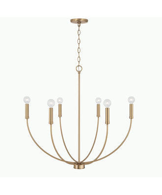 The Ansley 6-Light Chandelier in Aged Brass is a timeless addition to any home, effortlessly blending classic charm with modern sophistication. Its sleek contours and sweeping curves create a visually appealing silhouette that enhances any room's aesthetic without overwhelming it. The elongated arms gracefully extend outward, providing an open and airy feel that invites light and warmth into your space.