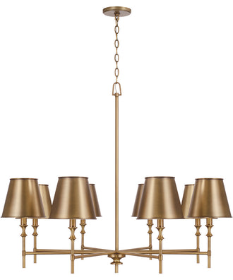 The Whitney 8-Light Chandelier in Aged Brass is a stunning refresh of the classic chandelier silhouette, bringing an elevated glamour to traditional style. Its design features eight metal shades that are perfectly balanced on a sleek frame, creating a harmonious blend of modern aesthetics and timeless elegance. The aged brass finish adds a warm, honey-gold hue with subtle black undertones, achieved through a meticulous scouring technique that gives it a refined, brushed visual texture.