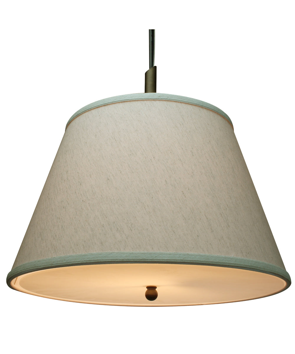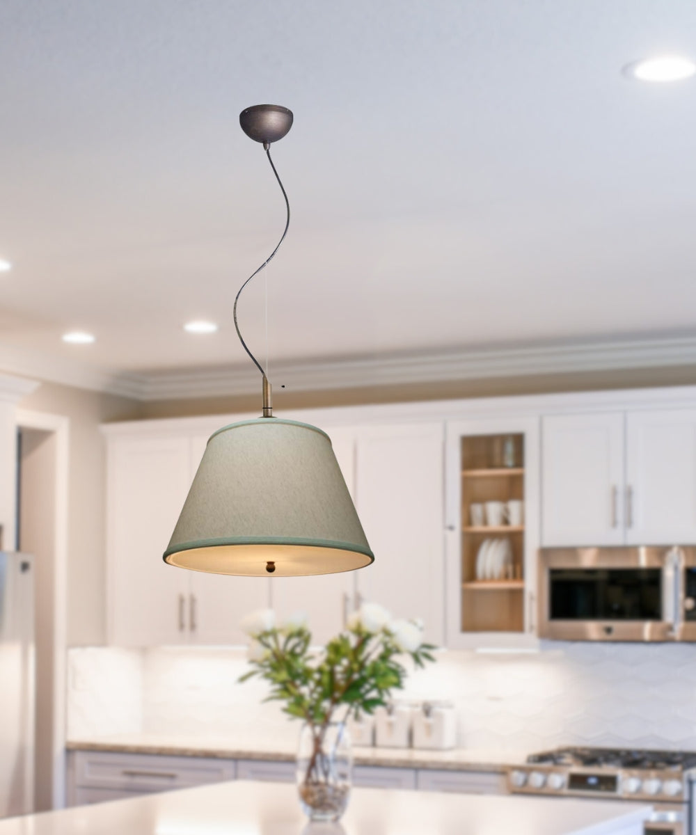 Pendant lights hang from a ceiling and place strong light over an island, table or furniture. Often the light is aimed downwards to help with tasks, but also outward to provide ambient lighting. A central stem or chain usually supports a single shade, although it may also support multple light bulbs. Pendants work well for dining and sitting areas. They can also be used in a hall or foyer if there is head-room. They are installed electrically and operated by a wall switch, and can also function as a centerpiece.