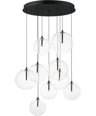 The Global 9-Light LED Chandelier in Black is a masterpiece of modern lighting design. It features an airy configuration of clear blown glass globe shades in various sizes, suspended on thin low voltage wires. This sophisticated arrangement creates an ethereal floating effect, making it a striking centerpiece for any room. The black finish of the thin tubes descending into the center of each globe adds a touch of contemporary elegance, perfectly complementing the clarity of the glass shades.
