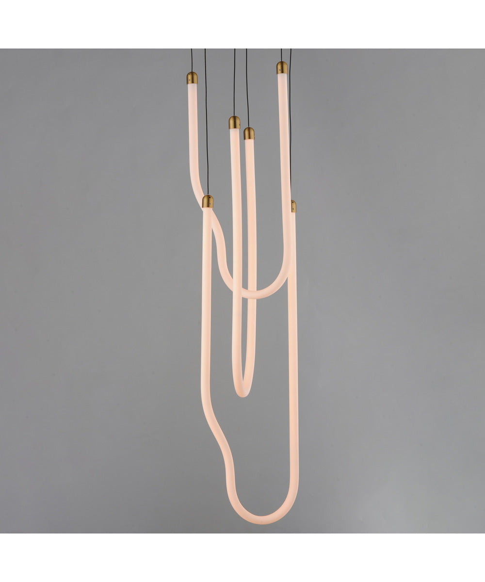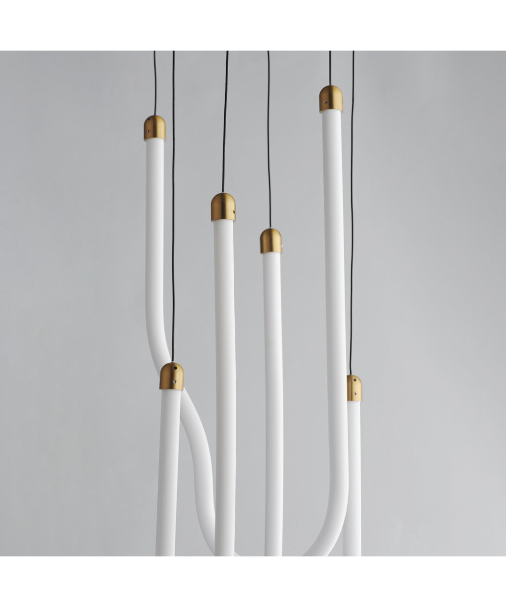 This pendant light features a natural aged brass finish that complements the matte white acrylic tubes beautifully. The combination of these colors creates a timeless look that can seamlessly blend with various interior color schemes, from modern minimalist to classic elegance.