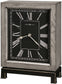 This unique mantel clock features a warm gray finished case on select hardwoods and veneers and a metal base finished in charcoal with silver edging. The aged black dial has white Roman numerals and minute track, antique white spade style hands, and a flat glass crystal. Quartz battery operated movement requires one AA size battery (not included). Height 12.25" (31 cm) Width 9" (23 cm) Depth 4" (10 cm)