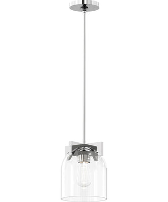 The Scoop 1-Light Pendant/Flush Mount in Polished Chrome is a striking addition to any home. With its sleek, modern design, this light fixture features cut-out metalwork that elegantly curves around a contemporary bell-shaped glass shade. The clear glass shade provides an unobstructed view of the bulb, enhancing the overall aesthetic with a touch of minimalism and sophistication.