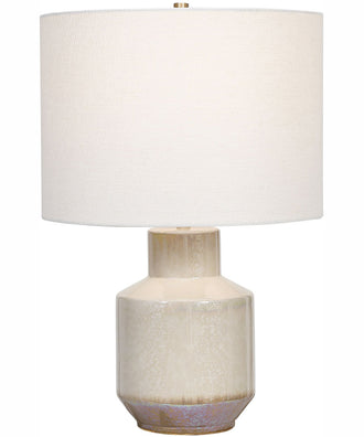 This beautiful table lamp is characterized by its iridescent cream base, and trimmed in a combination of rust and light shades of blue, which are enhanced by the brass tone accents. The soft cream, slightly textured drum shade is finished with a rolled ed