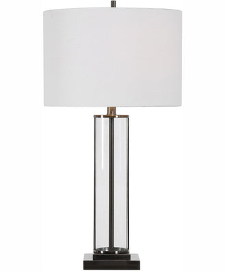 The glass cylinder design, with dark antique nickel accents, offers a clean, simple look. The round hardback shade is a white linen fabric.