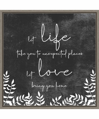 ART DESCRIPTION: Celebrate the power of love with this moving message...Let life take you to unexpected places. Let love bring you home. This Amanti Art canvas art print was created by JJ Design and printed by Amanti Art in Madison WI. The canvas is stretched by hand and finished with a float frame. Individually made using traditional custom framing techniques, it has the quality you would expect from your local frame shop. Because of our attention to detail and focus on artistry, architects, interior designers, and homeowners alike choose this framed canvas artwork to create beautiful living spaces.