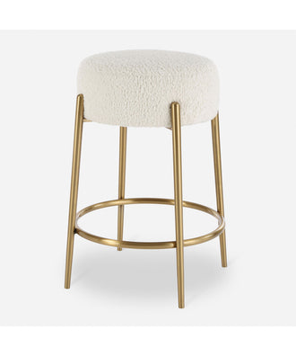 • Features: This plush counter stool is covered in a luxurious white faux shearling, suspended within brushed brass plated stainless steel legs.