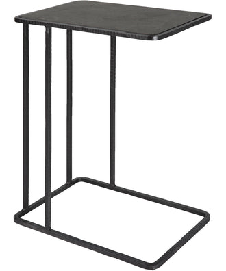 The perfect accent to your favorite seat, this pull up style table showcases a petite iron frame with organic carved details paired with a polished bluestone top, complete with natural characteristics of white marbling and veining throughout.