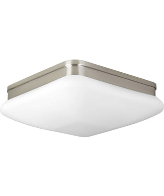 With an elevated style, the two-light 11 inch flush mount appeals to current home decor trends. Soft contemporary design includes square etched opal glass. Damp location listed. Brushed Nickel finish.