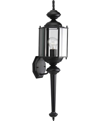 Illuminate the path to your home with this single-light wall lantern. The traditional style and black finish enhance the exterior designs of homes sided in brick, vinyl, stone, wood, or aluminum. Solid brass hexagonal wall torch with clear beveled glass panels.