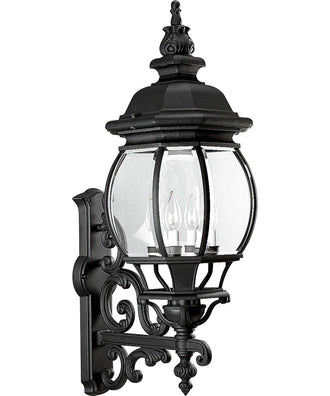 Detailed finials, end caps and scroll work in a durable power coat finish, featuring clear beveled glass panels and cast aluminum frames. Four-light wall lantern.