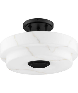 The Tosca Collection semi-flush mount ceiling light features a Matte Black finish with tiered round glass shade crafted with a faux alabaster finish that radiates patterns of light and shadow, adding depth and warmth that enchant any room. This fixture is part of the Progress Lighting Design Series, a lighting collection offering fashionable styles and luxury lighting for the home. fashionable styles and luxury lighting for the home.
