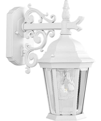 The Welbourne collection features hexagonal framework with vine inspired scrolls and clear beveled glass panels. Cast aluminum construction with durable powder coat finish. One-light 6-1/2" top mount outdoor wall lantern.