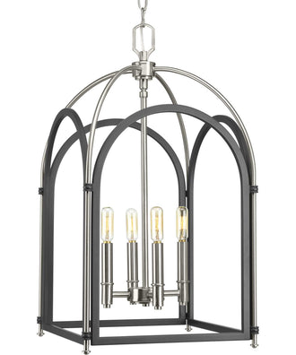 Westfall is a distinctive combination of arching elements that create a dramatic soaring frame. A dual-tone finish of Graphite with Brushed Nickel highlights the distinctive form and provides rich contrasting surround for a classic candelabra cluster. Metal fittings add a touch of elegance and dimension to further enhance the classic form of this four-light medium foyer pendant.