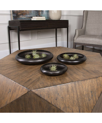 Set Of Three, Cast Aluminum Trays Feature A Dark Black Nickel Finish. Sizes: S-9x2x8, M-11x2x11, L-14x3x14Uttermost's Decorative Bowls & Trays Combine Premium Quality Materials With Unique High-style Design.With The Advanced Product Engineering And Packaging Reinforcement, Uttermost Maintains Some Of The Lowest Damage Rates In The Industry. Each Product Is Designed, Manufactured And Packaged With Shipping In Mind.