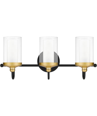 Available in either two or three bulbs, the Rowland bath light can be positioned up or down to cast a unique illumination. This light, inspired by a modern farmhouse aesthetic, combines a matte black finish with brass-toned details. Clear glass shades beautifully maximize light.