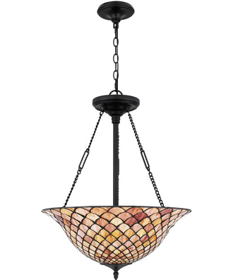 The timeless warmth of Tiffany glass comes to life in the Ursa collection. The matte black finish provides the perfect framework to let this design's multicolored glass tiles take center stage. Ursa is available as a pendant, mini pendant, or semi-flush mount.